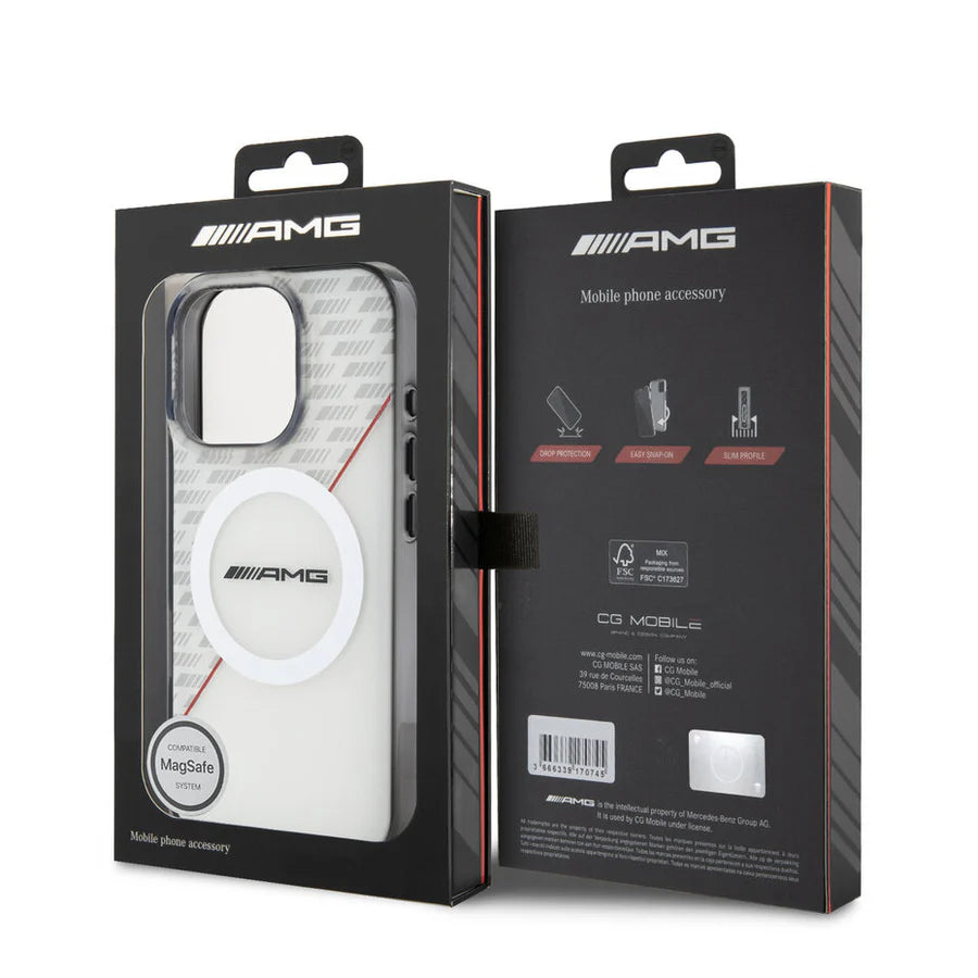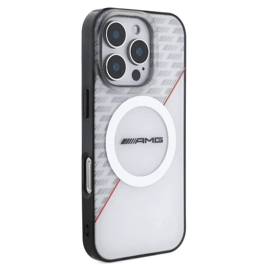 AMG MagSafe-Hülle für iPhone 16 Pro Max – Grau/Schwarz mit Carbon-Muster & rotem Akzent