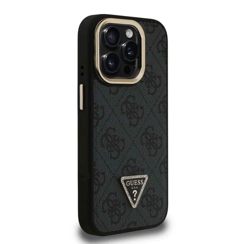 Die elegante Guess 4G Strass Logo Hülle in Schwarz vereint luxuriöses Design mit cleveren Funktionen. Das stilvolle 4G-Muster mit dem ikonischen Guess-Dreieckslogo, verziert mit funkelnden Strasssteinen, macht dein iPhone 15 Pro Max zum echten Eyecatcher.