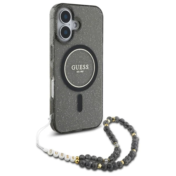 GUESS Glitzerhülle mit MagSafe & Perlenarmband – für iPhone 16 (Schwarz)