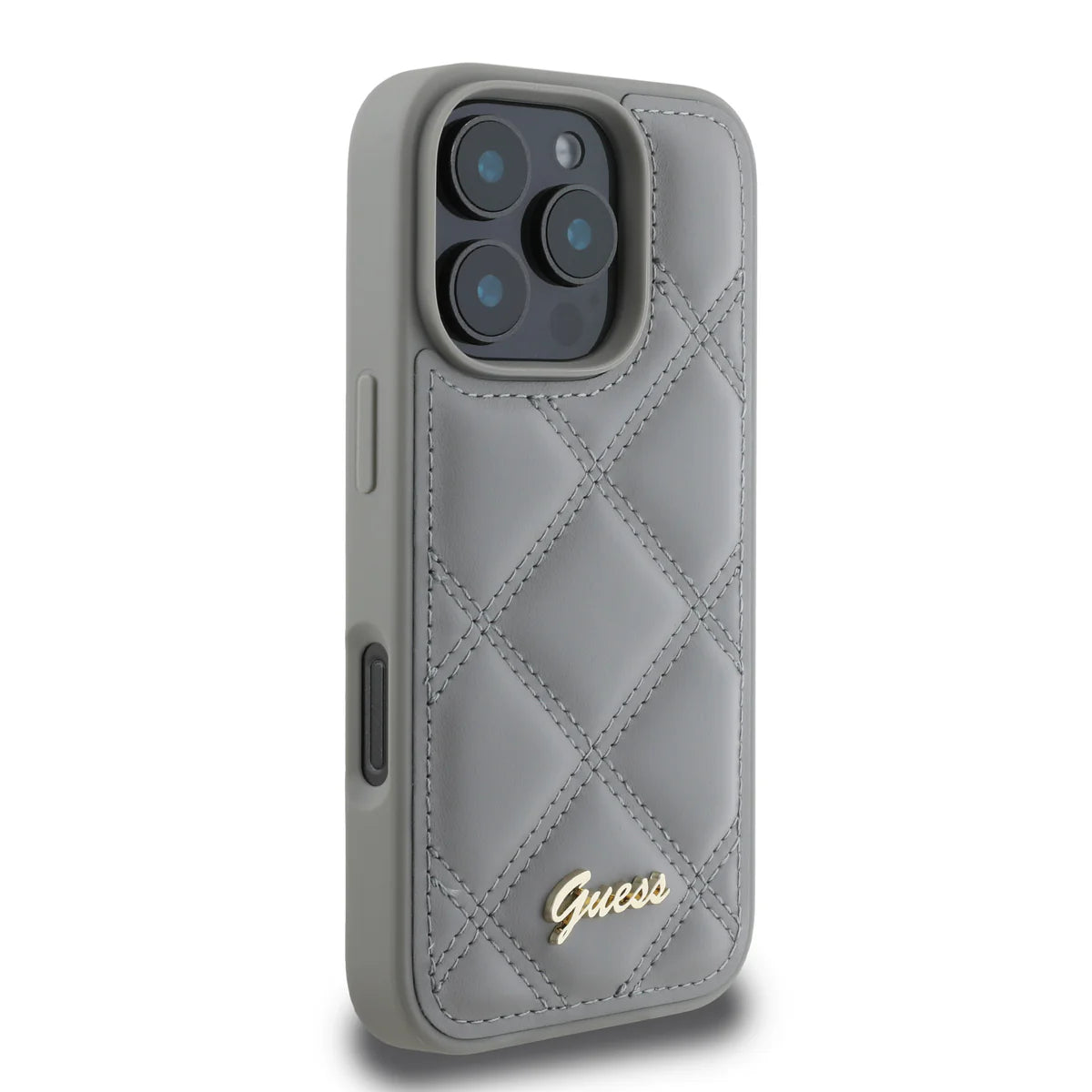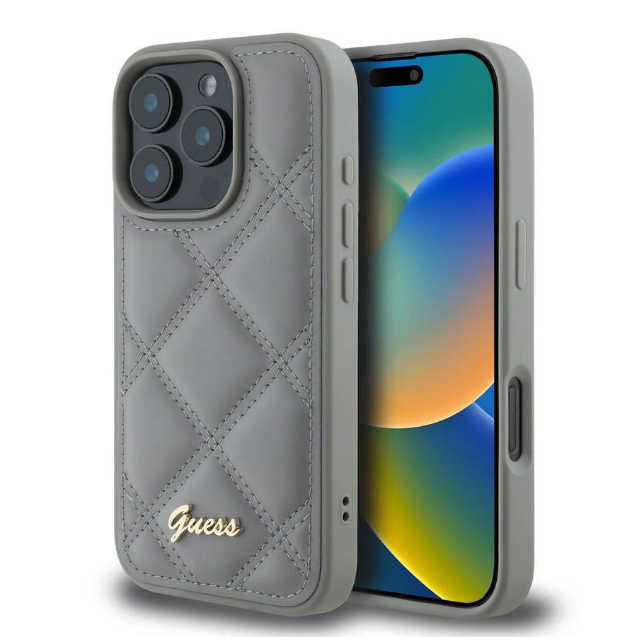 GUESS Handyhülle für iPhone 16 Pro Max – Grau mit Steppdesign & Metall-Logo