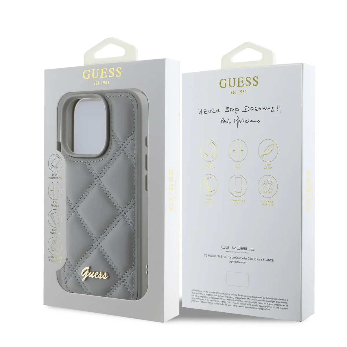 Diese edle GUESS Hülle in klassischem Grau überzeugt mit elegantem Steppmuster und luxuriösem Look. Das weiche Finish mit dekorativer Naht und das goldene Guess-Logo verleihen deinem iPhone 16 Pro Max eine stilvolle Optik – perfekt für alle, die modischen Chic und zuverlässigen Schutz verbinden möchten.