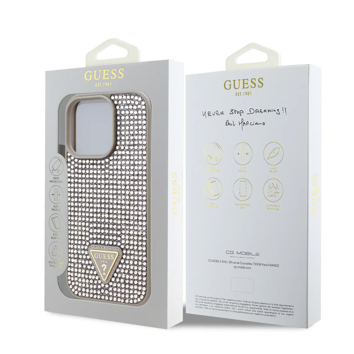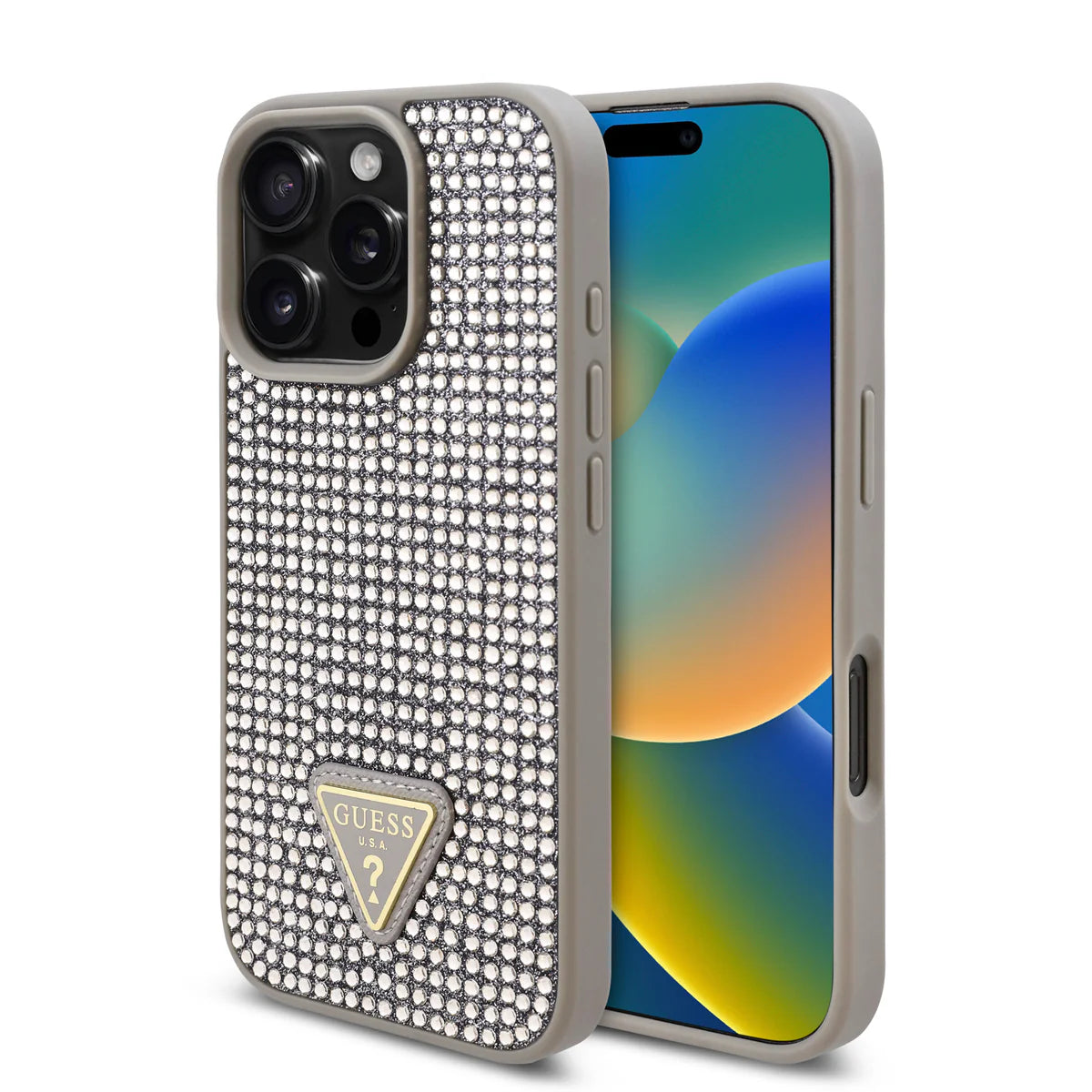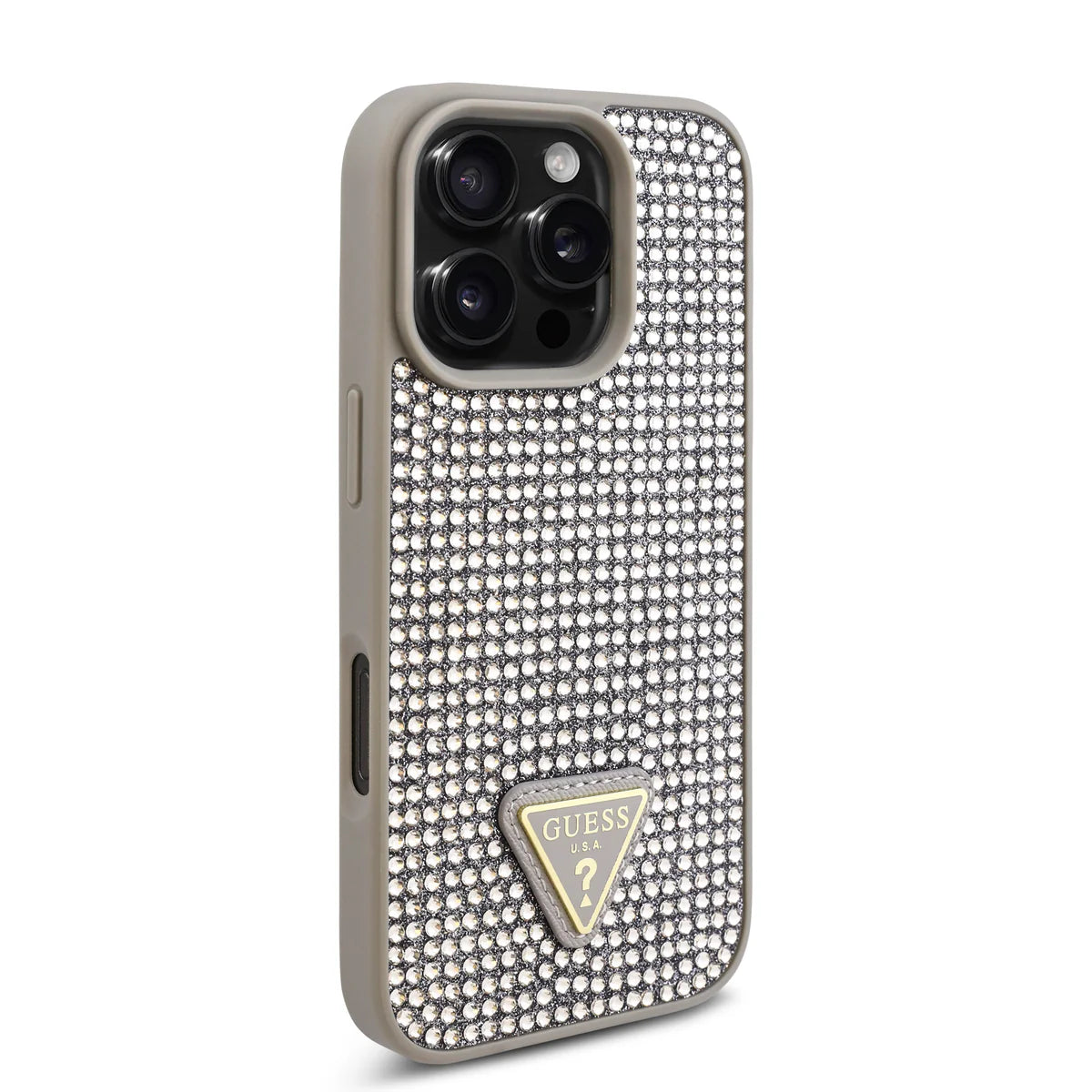 GUESS Handyhülle für iPhone 16 Pro Max – Silber mit Strassbesatz & Triangle-Logo