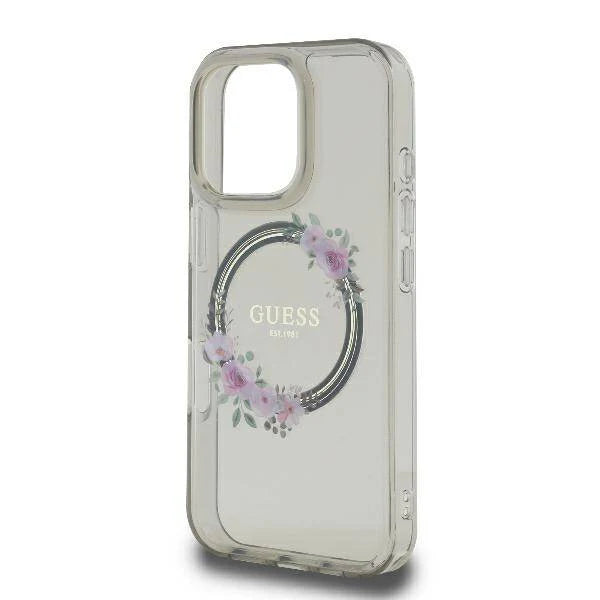 GUESS Handyhülle für iPhone 16 Pro Max – Transparent mit Blumenkranz & Logo