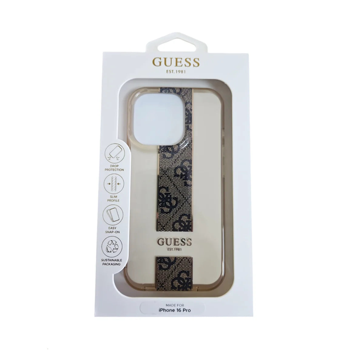 GUESS Handyhülle für iPhone 16 Pro Max – Transparent mit Monogramm-Streifen & Logo