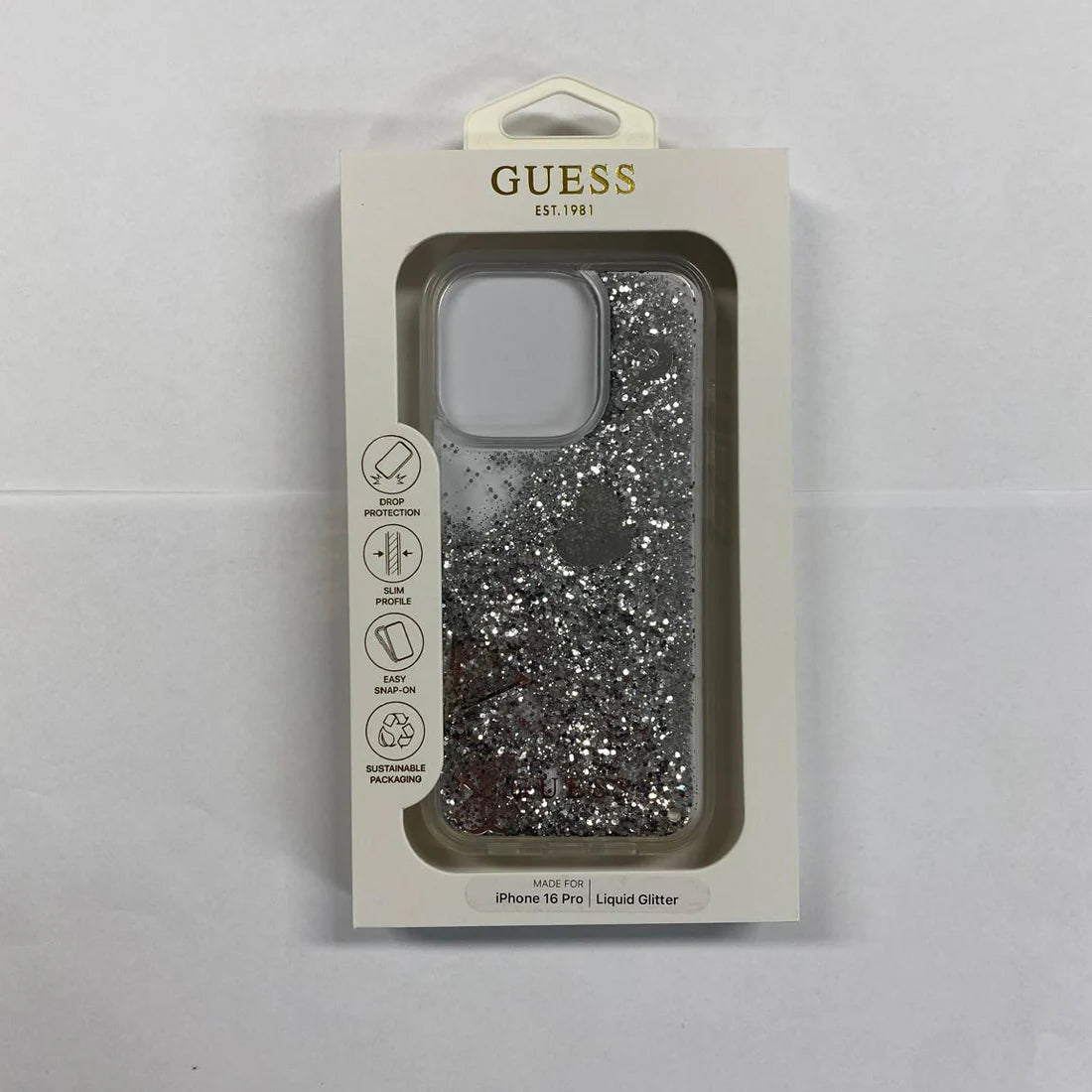 GUESS Liquid Glitter Hülle Silber für iPhone 16 Pro – Glanz, der bewegt