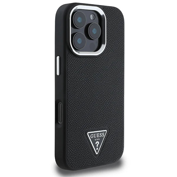 GUESS Saffiano Hülle Schwarz für iPhone 16 Pro – Klassisch. Stark. Magnetisch