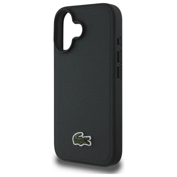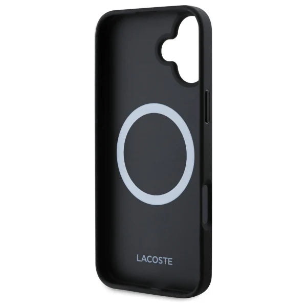 Lacoste iPhone 16 Hülle – Schwarze MagSafe Schutzhülle mit 3D-Krokodil-Logo