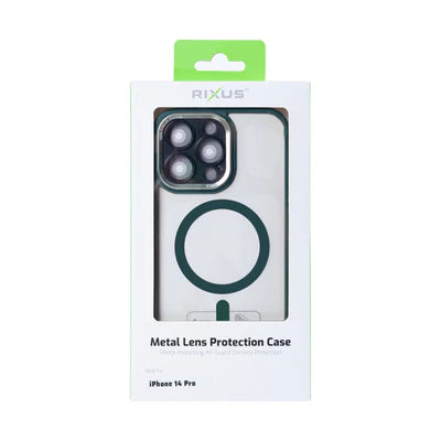 RIXUS MagSafe‑Clear‑Hülle in Dunkelgrün mit Metall‑Kameraschutz – für iPhone 14 Pro