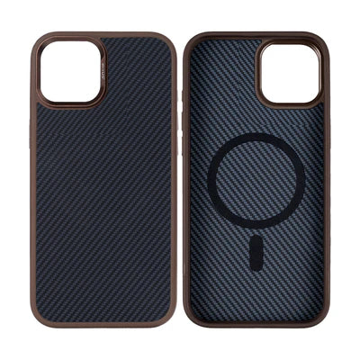 RIXUS MagSafe-Hülle im Carbon-Faser-Look für iPhone 13 – Schwarz mit Braunem Rahmen