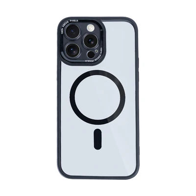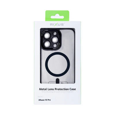 RIXUS MagSafe Hülle Transparent Schwarz mit Metall-Kameraschutz – für iPhone 15 Pro