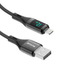 Schnellladekabel mit USB-A auf Lightning Anschluss und integriertem Display zur Anzeige der Ladeleistung. Kompatibel mit iPhones, iPads und weiteren Apple-Geräten mit Lightning-Anschluss. Länge: 1 Meter. Ideal für effizientes und sicheres Laden.